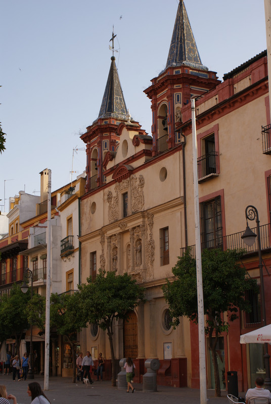 La portada, de estilo barroco, es obra de Lorenzo Fernández de Iglesias y Diego Antonio Díaz. Se construyó en el siglo XVIII y está considerada una de las mejores del barroco sevillano. Cabe destacar los colores albero y sangre de toro con que está decorada, colores que acompañan a otros edificios emblemáticos de la ciudad. En el costado que da a la calle Placentines posee otra portada. Ésta es mucho más sencilla que la portada majestuosa anteriormente descrita. Como anécdota, se hace referencia a que bajo ella se cobija tradicionalmente la imagen del Señor de la Sagrada Cena en la mañana del día del Corpus Christi.